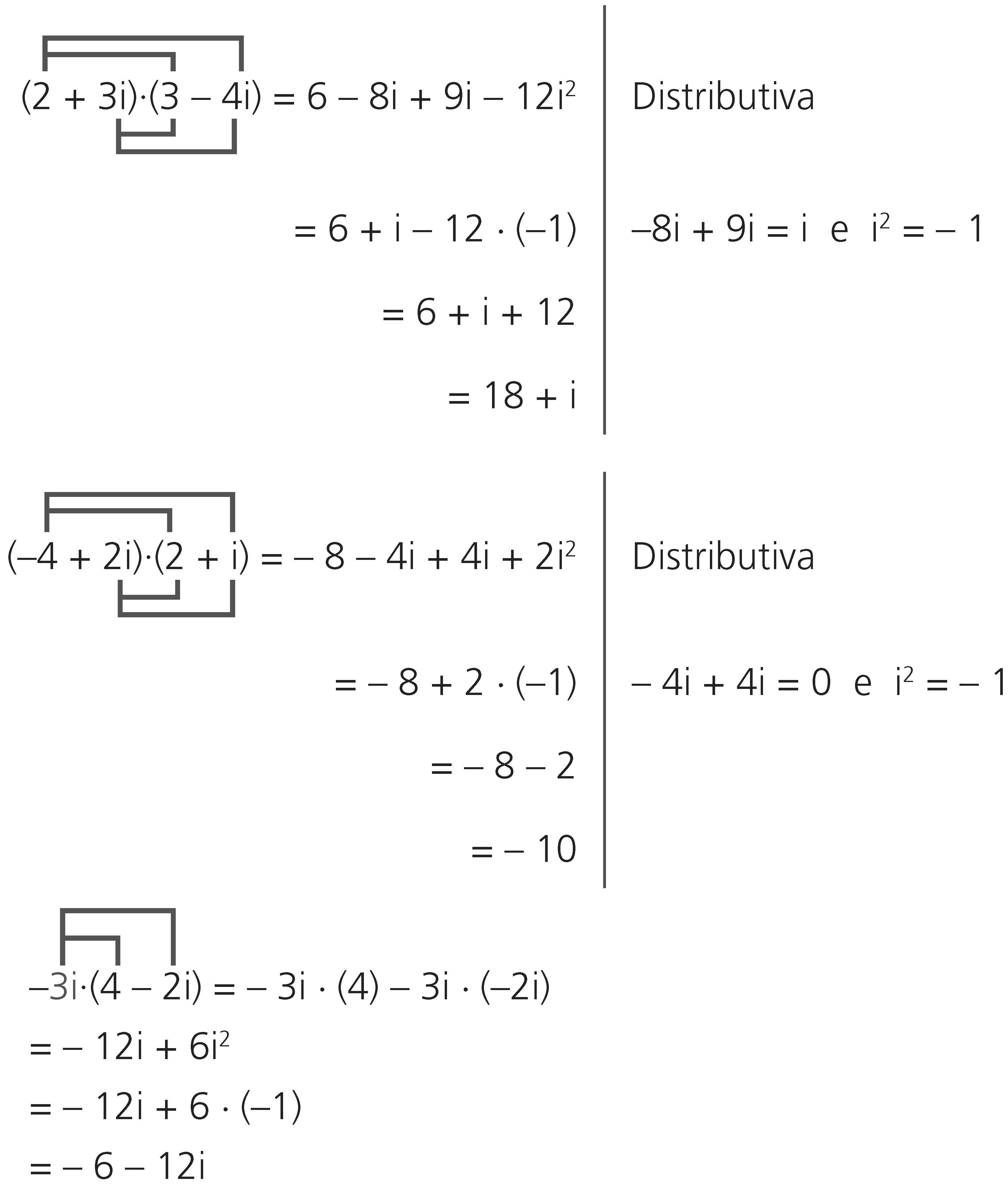 Multiplicamos números complexos como multiplicamos binômios, usando i²=–1.
