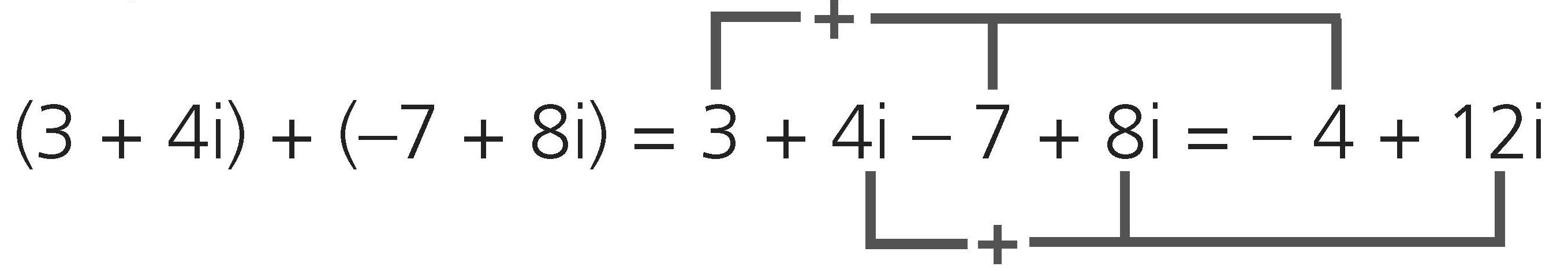 (3 + 4i) + (-7 + 8i) = (3 – 7) + (4 + 8)i = -4 + 12i