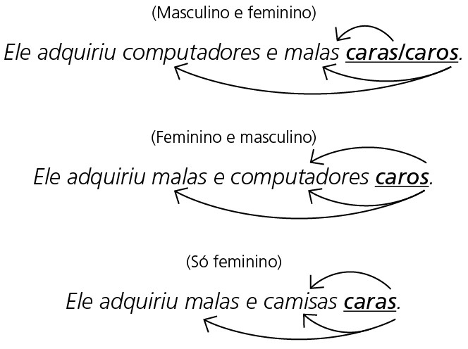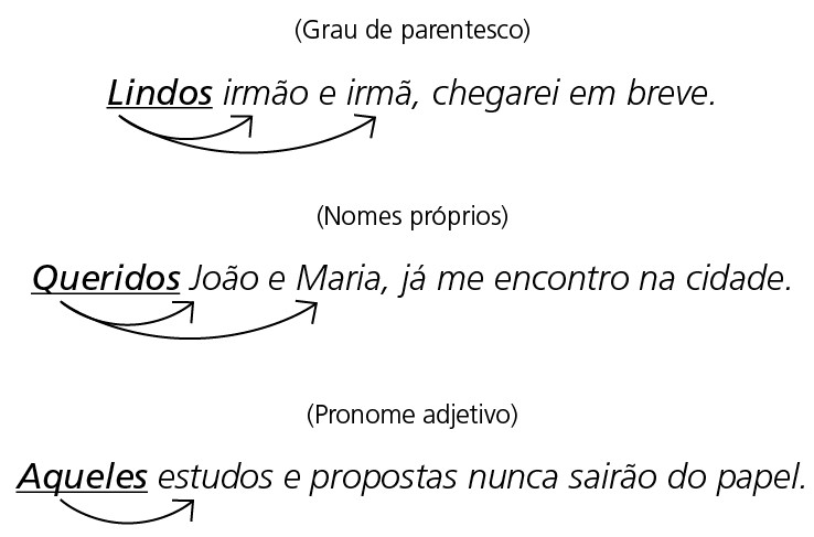 Nesse caso, o adjetivo (e o pronome adjetivo) concordará em gênero e número com o núcleo mais próximo (concordância atrativa), indo ao plural (concordância gramatical em que o masculino prevalecerá) necessariamente apenas quando estiver diante de nomes próprios ou de parentesco. Vejamos:
