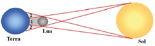 Na região 1, observa-se o eclipse total e na região 2, parcial.