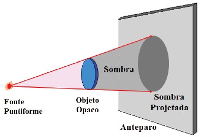 Observe o experimento abaixo com uma fonte pontual, um objeto opaco e um anteparo também opaco. O cone de luz divergente proveniente da fonte ilumina o anteparo, no entanto, haverá uma região atrás do objeto desprovida de luz. Essa região é denominada sombra. Vale ressaltar que o formato da sombra projetada no anteparo é semelhante ao objeto opaco colocado na frente da luz, evidenciando a propagação retilínea da luz.