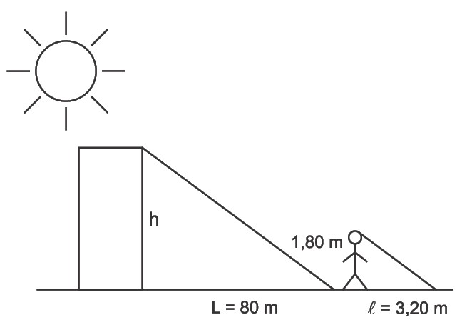 Exercício Resolvido 1: O edifício Monumental, localizado em um shopping de São Luís/MA, iluminado pelos raios solares, projeta uma sombra de comprimento L = 80 m. Simultaneamente, um homem de