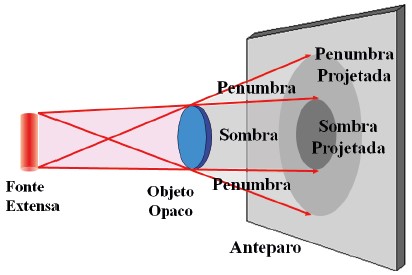 Se no lugar de uma fonte pontual, colocarmos uma fonte extensa, além da sombra haverá regiões parcialmente iluminadas denominadas penumbras.
